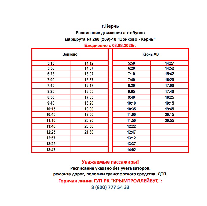 Новое расписание автобусов маршрута № 330-18 «Курортное-Керчь АВ» и маршрута № 268(269)-18 «Войково-Керчь АВ» с 08.08.2025 г.